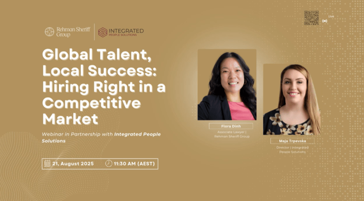 Hiring the right people is tougher than ever in today’s competitive talent market. The webinar with Rehman Sheriff Group explores how businesses can strategically plan, sponsor, and integrate both local and overseas talent while staying compliant with immigration and Fair Work laws.